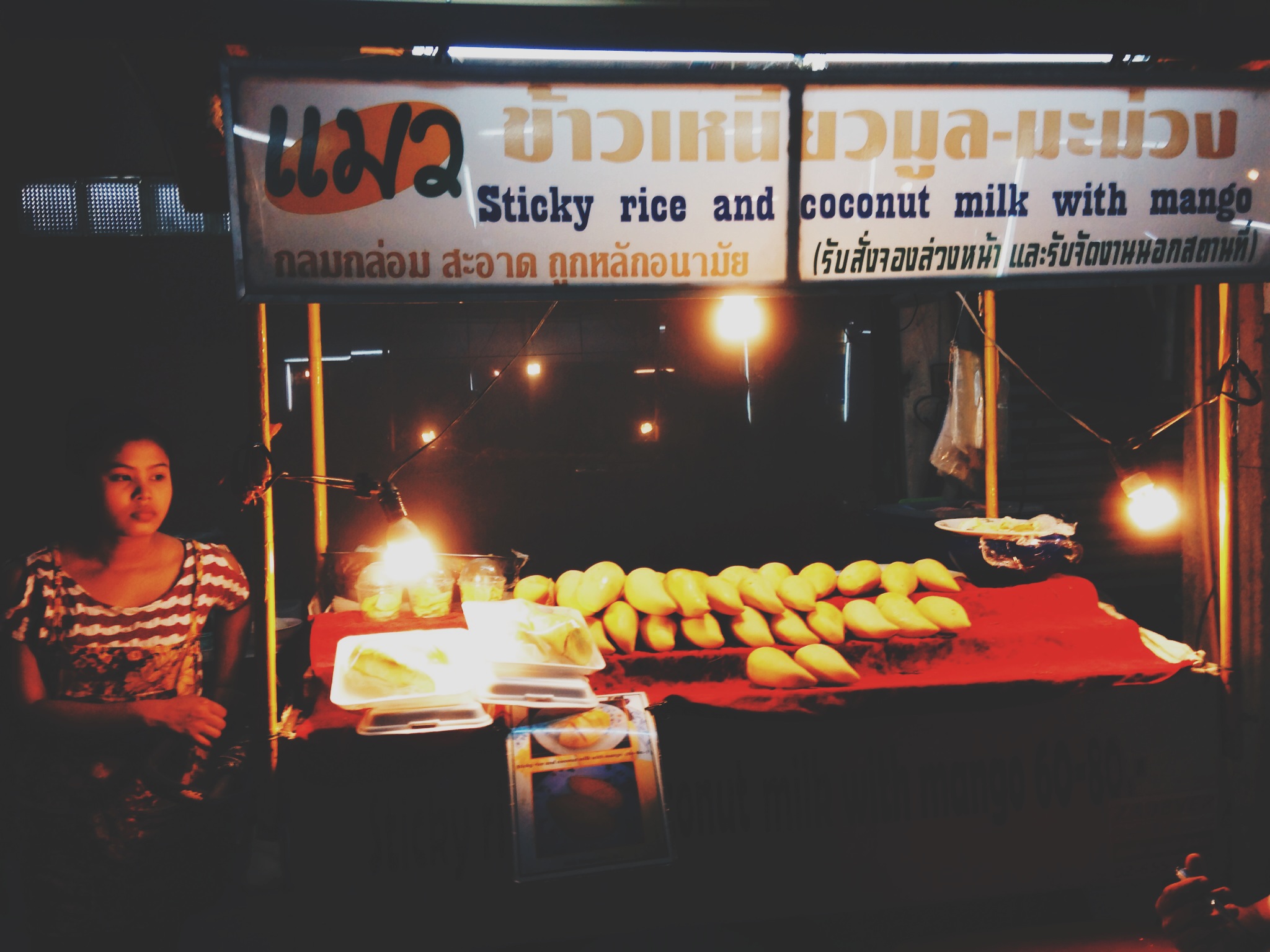 Aksam yemegini sokakta yiyelim dedik. Kaldigimiz hostelimizin sokagi sabah ne kadar sessiz sakin bir yerse, aksam tam tersi o kadar kalabalik ve gurultulu bir yerdi. Her yerde insanlar minik taburelere oturmus keyifli keyifli yemek yiyorlardi. Yemegin en keyifli kismi mango sticky rice idi. Tatli sevenler buraya gelince mutlaka denemeli! Bir porsiyon icin 60 baht (5 tl ) gibi bir ucret odedik.